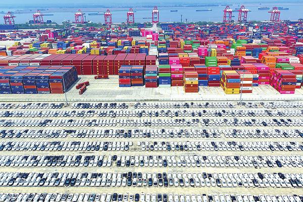 图为4月10日在江苏省港口集团南京港龙潭港片区拍摄的等待远销的汽车。